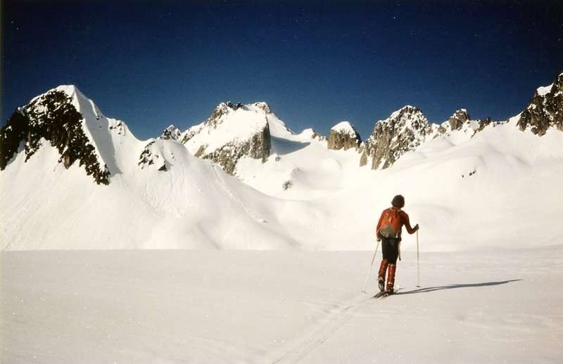 Bilou au col des Aiguillons, en Lauzière. Au large, le Grand Pic. Le tout vierge de traces… C’était vers 1976…