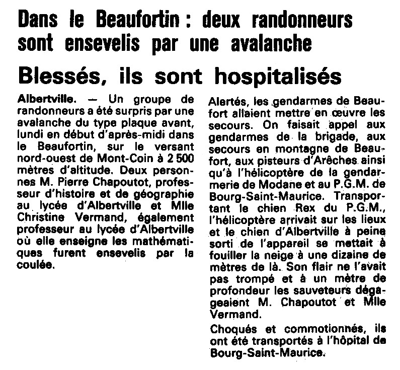 L’article du Dauphiné Libéré sur notre avalanche… Avec les sottises de rigueur, du style de la « plaque avant » (il est vrai qu’on avait été pris « par derrière » !)