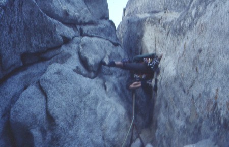 Bernard en train d’essayer de s’arracher les genoux dans le « Wilson Overhang » à la voie Steck-Salathé de Sentinel Rock (Yosemite)